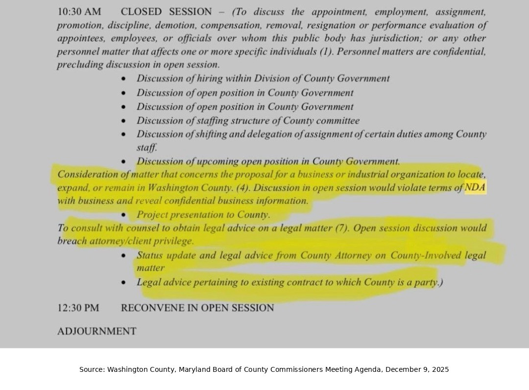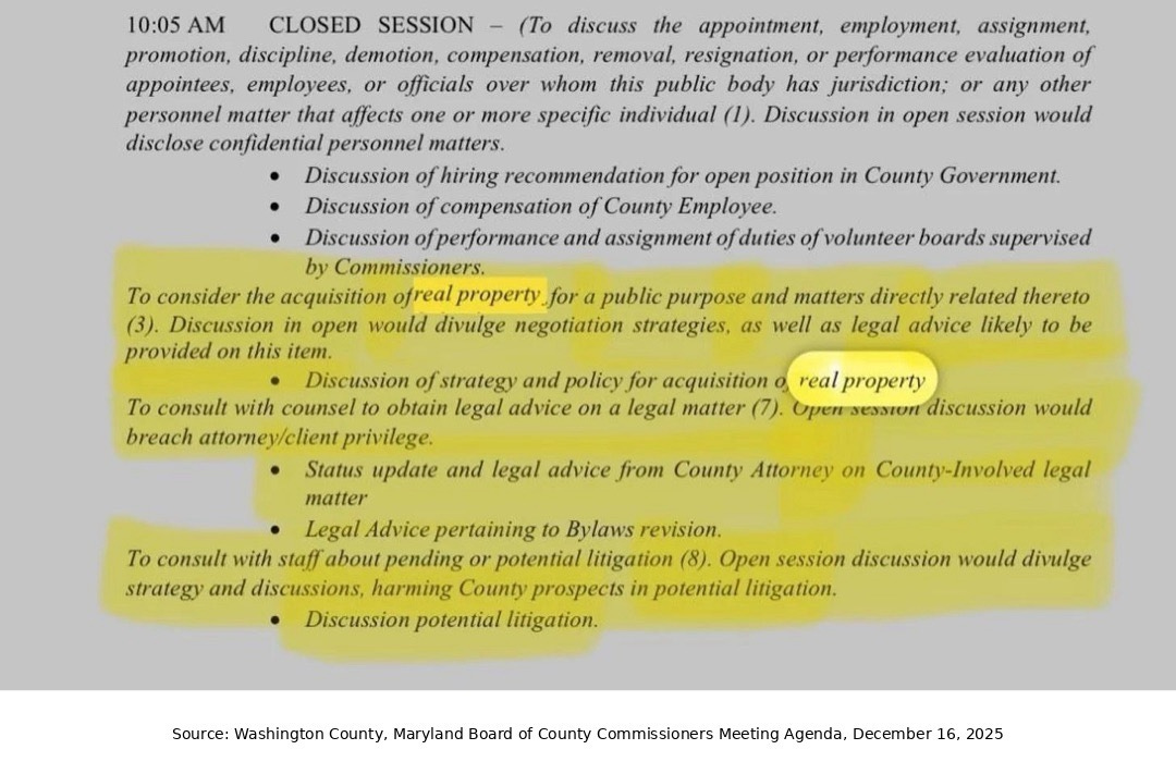 Based on a review of official county documents and meeting records, we have discovered that the Washington County Board of County Commissioners (BOCC) signed a non-disclosure agreement (NDA) in early December tied to a confidential land project. While there is not yet evidence regarding which project the NDAs covered, the timeline of the now-public plan by the Department of Homeland Security to acquire a warehouse near Hagerstown for use as an ICE detention facility would aligns with these NDAs.