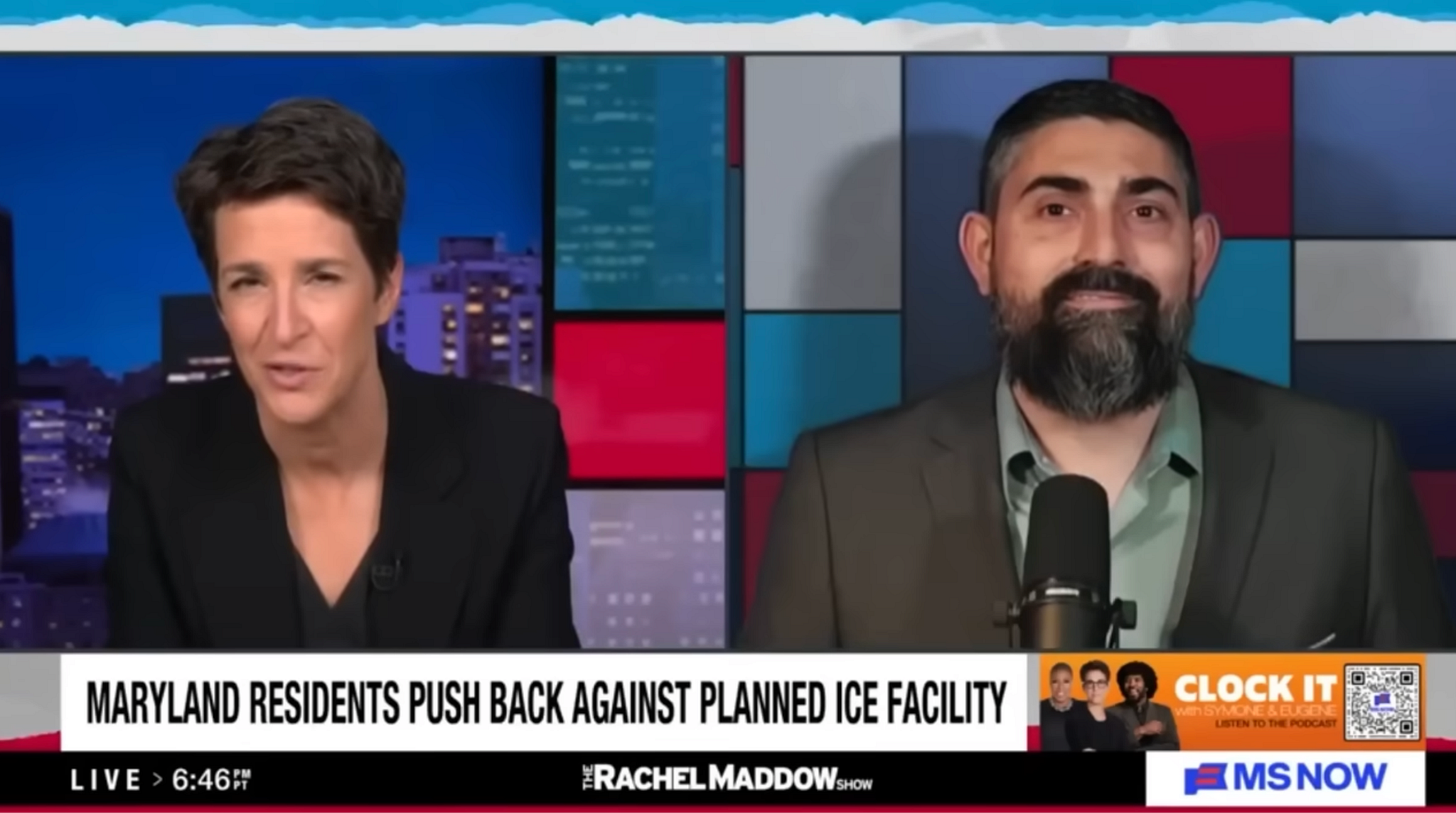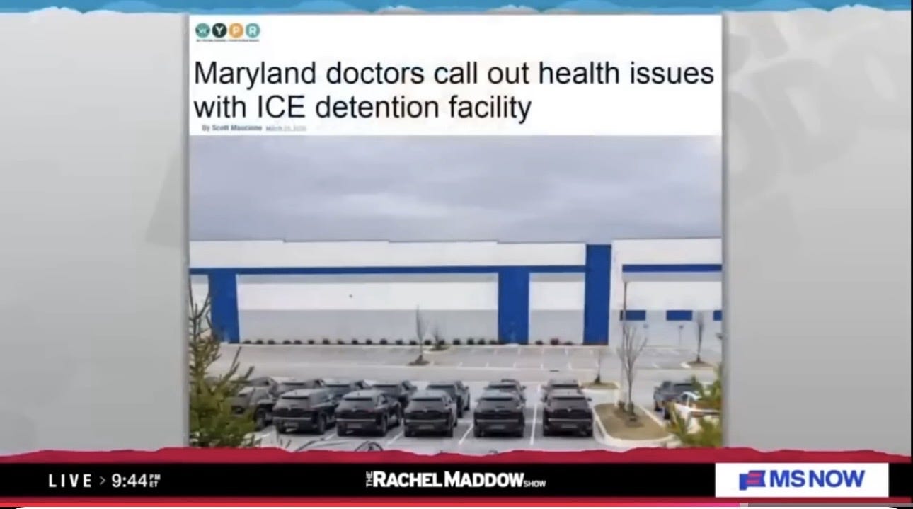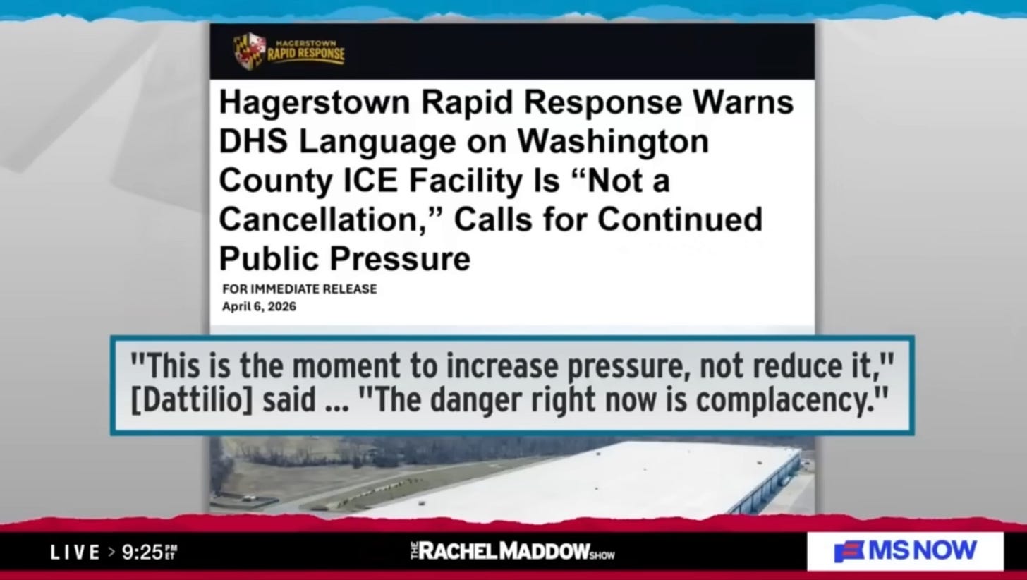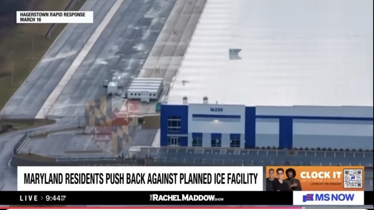“All of this hustle. The protests, the drone footage, the documents, the letter from the doctors...all of this hustle in what really is a pretty Republican part of blue-state Maryland. The work of these local activists has now been incorporated into a lawsuit by the state that’s trying to stop the Hagerstown facility and another one they want to build elsewhere in Maryland...And now after months of effort like that at the local level there are these headlines about the programs potentially stopping nationwide and specific headlines saying that Homeland Security is reconsidering the scope of that Hagerstown ICE prison. Reconsidering the scale of it. Saying “oh the conversion of it to a prison is not imminent after all.” I’ll tell you, nobody in Hagerstown is declaring victory over this, but boy have they thrown a lot of sand in the gears. And in a way that has had some signaled success in Hagerstown, Maryland. And that may help show the way in stopping this whole project for the whole damn county.” - Rachel Maddow