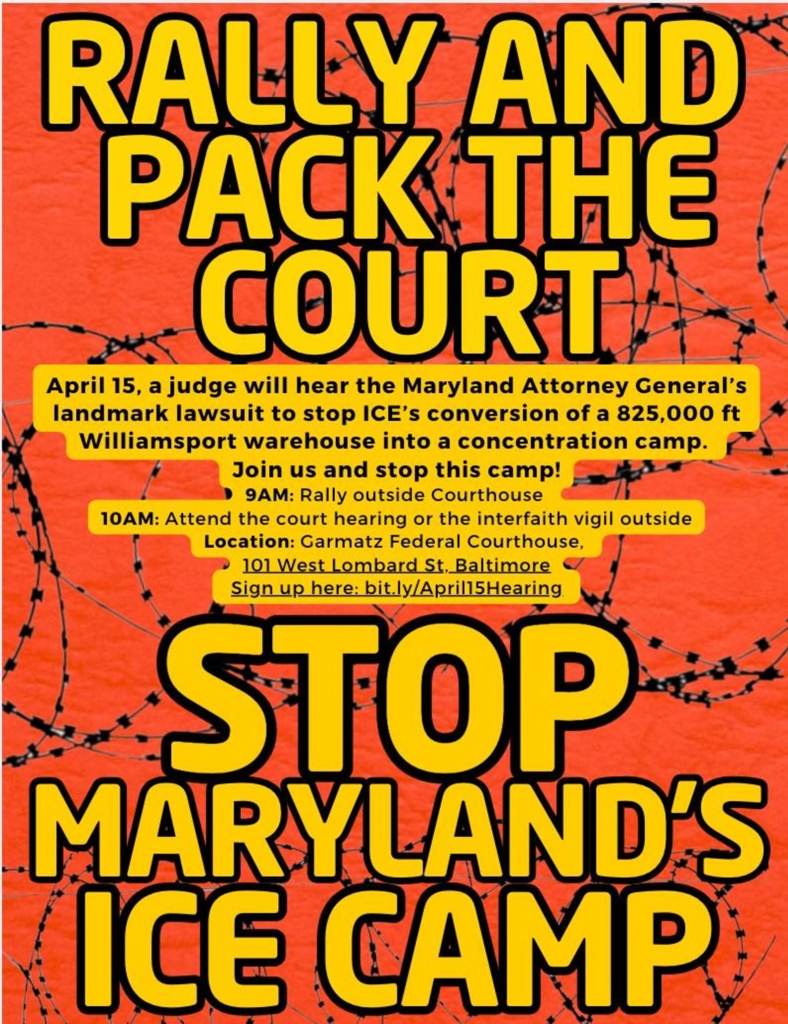 On April 15, a judge will hear Maryland Attorney General Anthony Brown’s landmark lawsuit seeking to stop ICE’s conversion of the 825,000-square-foot Williamsport warehouse into a detention facility. We need the courtroom packed, the courthouse steps filled, and the streets outside impossible to ignore.
