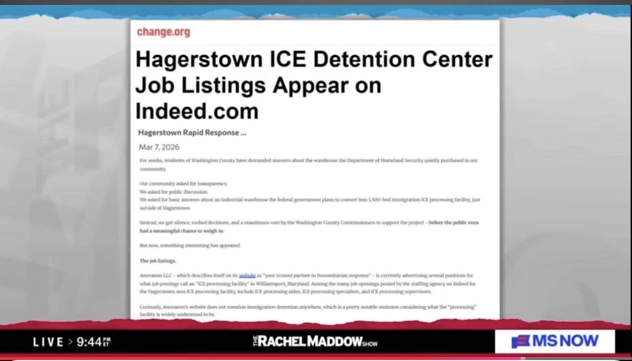 What makes this moment especially significant is that Maddow did not simply report on what is happening here. She recognized that Hagerstown may be offering something larger: a roadmap. Her observation that our work “may help at least show the way in stopping this whole project for the whole damn country” should resonate far beyond Washington County. The federal government is watching what it can get away with here. Other communities are watching how to respond. If this proposed detention warehouse can be stopped through coordinated public pressure, legal action, health advocacy, and relentless scrutiny, then Hagerstown may indeed become the model others follow.