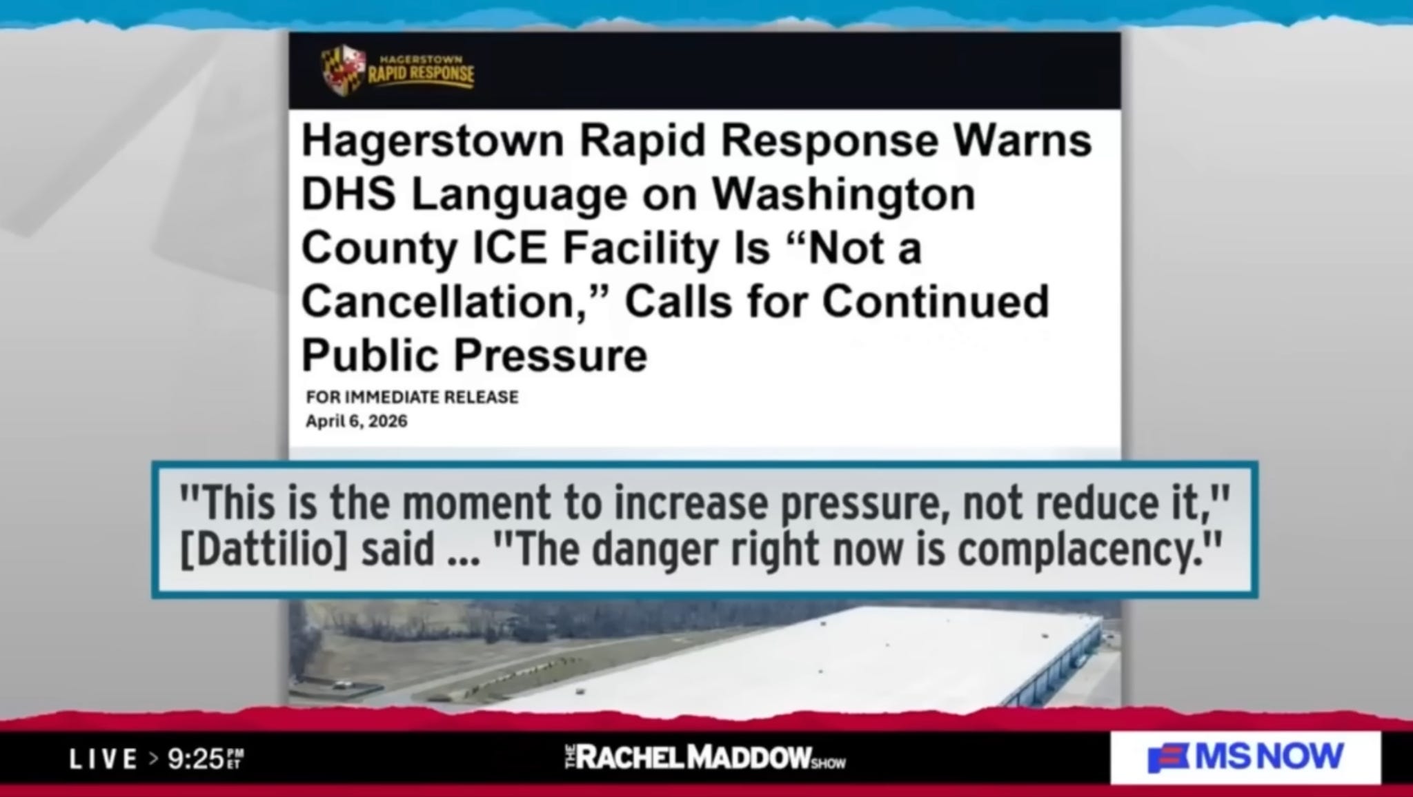 On Monday night, Rachel Maddow said on national television what so many of us here in Washington County have known for months: this fight is working because the pressure is working. Her words were not just a recognition of the work Hagerstown Rapid Response, our partners, and you have done on the ground. They were a reminder of something much bigger. What is happening here in Hagerstown is becoming a blueprint for how communities everywhere can fight back when federal agencies attempt to force dangerous and deeply harmful detention infrastructure into their neighborhoods.
