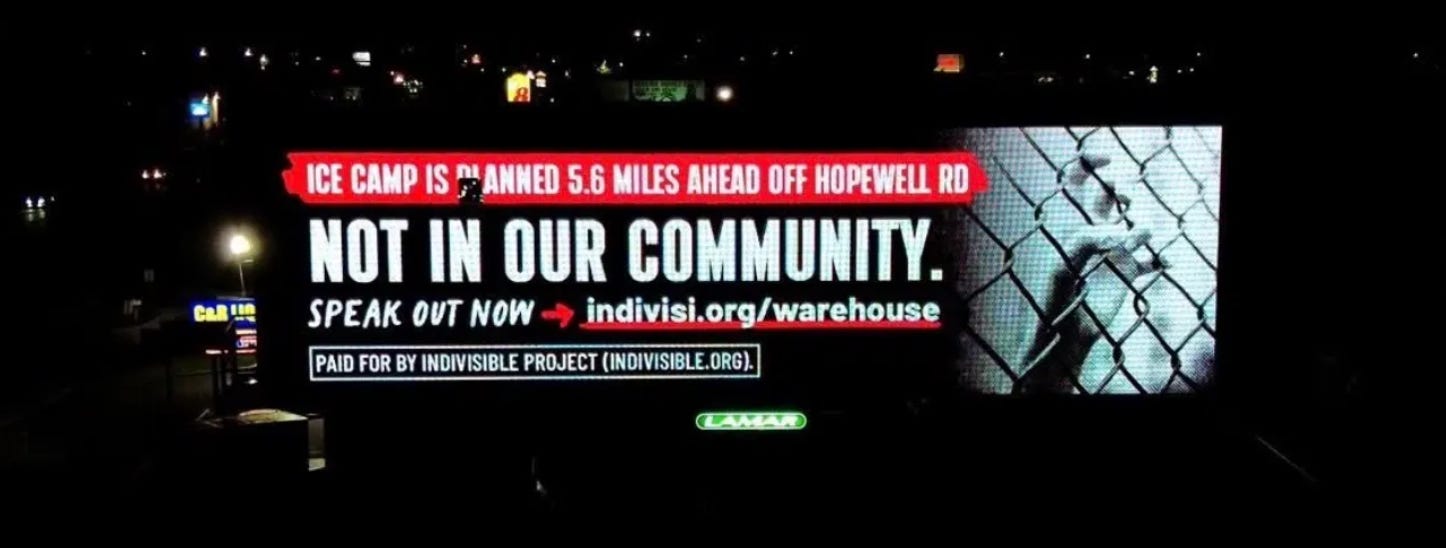 That dynamic has forced us to respond with a strategy that blends investigation, persistence, and visibility. Last week, we escalated our efforts by partnering with the national network Indivisible to install a billboard along Dual Highway that reads, “ICE Camp 5.6 Miles Ahead. Not in Our Community.” The placement is intentional. It ensures that anyone traveling toward the proposed site is confronted with a message that local officials have tried to keep abstract or obscured. What was once confined to meeting rooms, legal documents, and incomplete disclosures is now unavoidable in the daily landscape of the county.