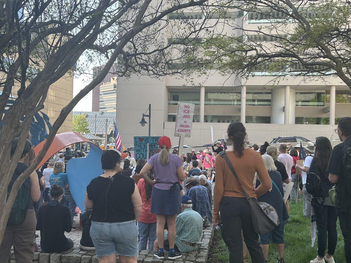 This morning, hundreds of us gathered outside the federal courthouse in Baltimore to send a clear message: Washington County will not quietly become the site of a new ICE detention warehouse. We came from Hagerstown, Baltimore, Montgomery County, Frederick, and communities across Maryland. Faith leaders stood beside immigrant rights advocates. Longtime organizers stood beside people who are joining this fight for the first time. The energy outside the courthouse was unmistakable. People understand what is at stake, and they are showing up.